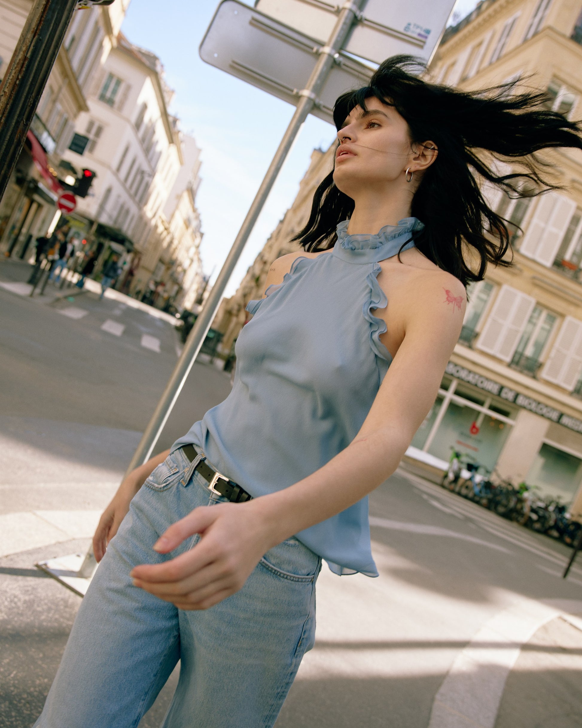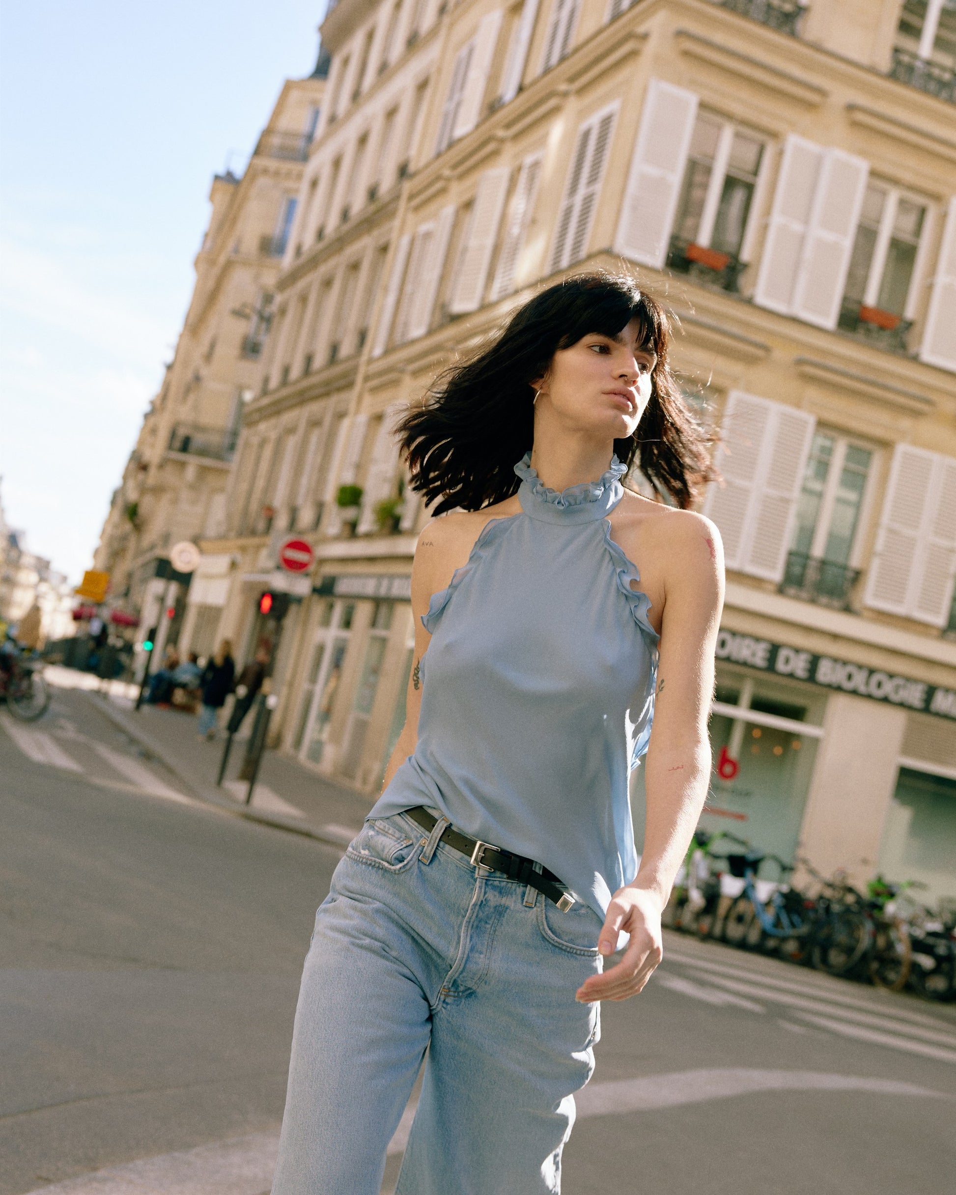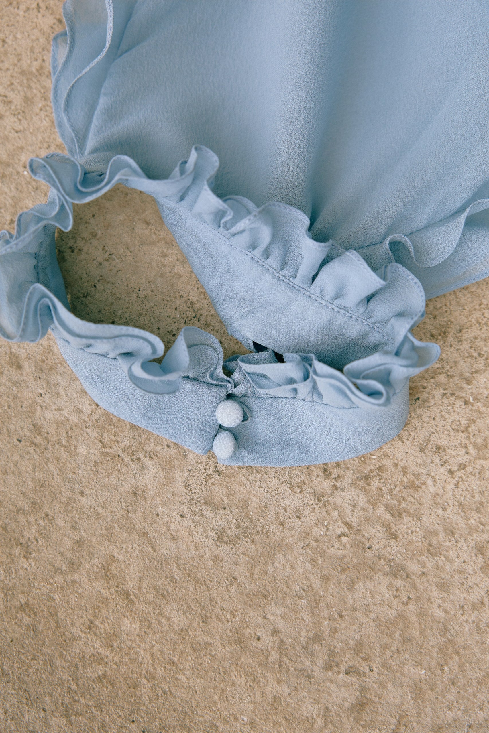 This exquisite silk top is a showcase of elegant design, featuring an open back. Delicate ruffles trim the edges, complementing the free-flowing silhouette. Presented in celestial blue and creamy white with a lace-like texture, this piece blends romantic flair with effortless elegance. Versatile enough for an evening out or casual daytime wear, this top adds a sophisticated and unique touch to any ensemble.
