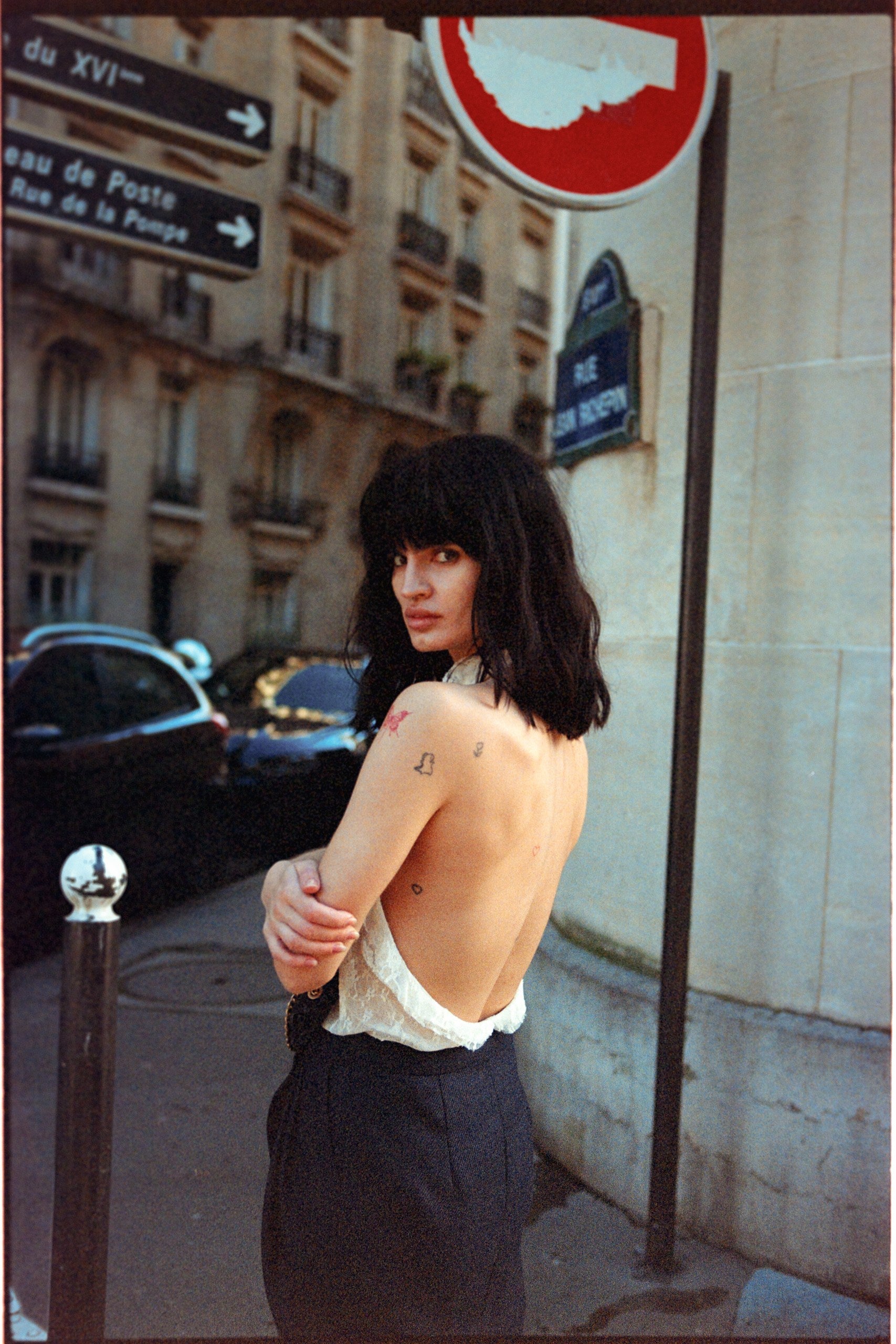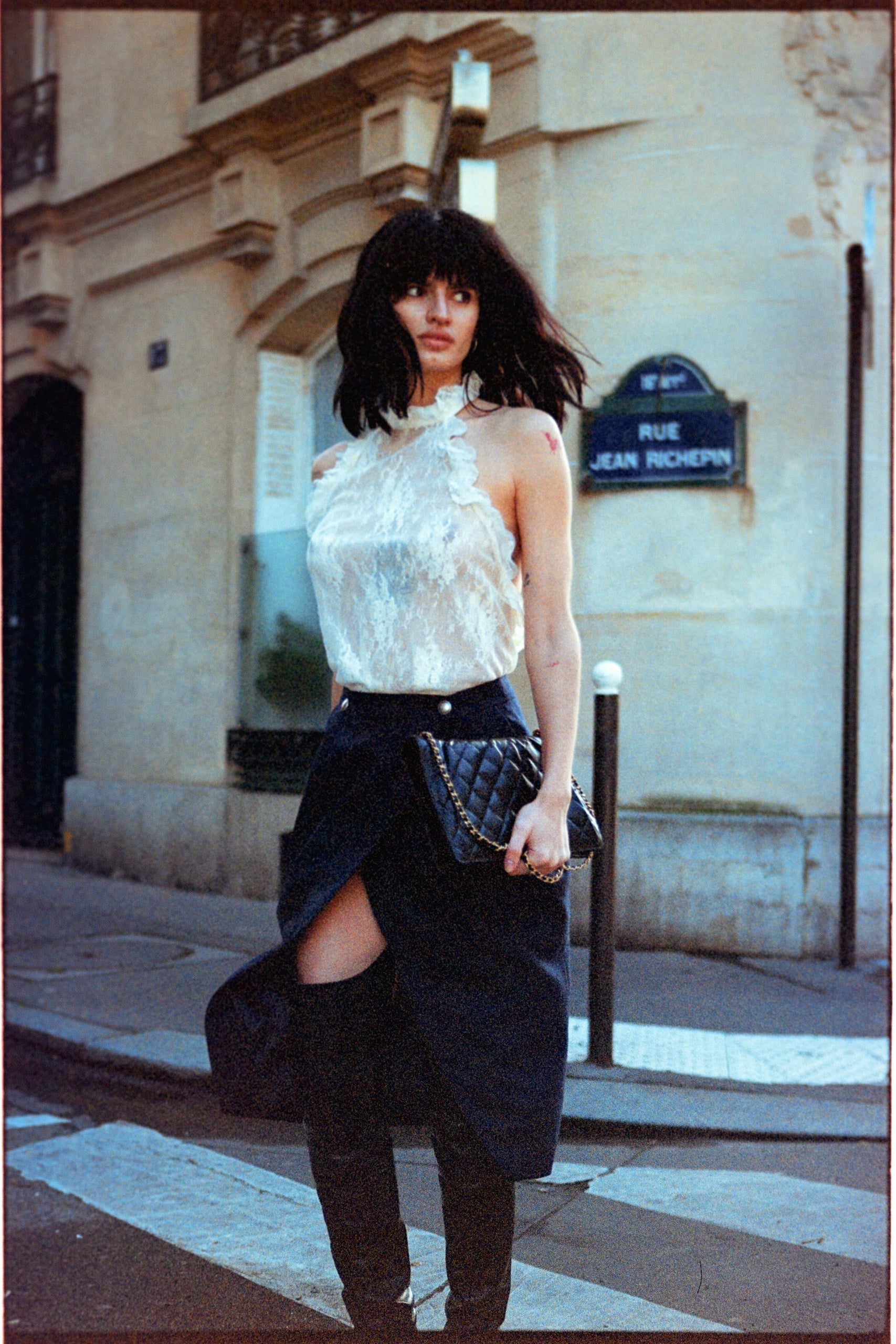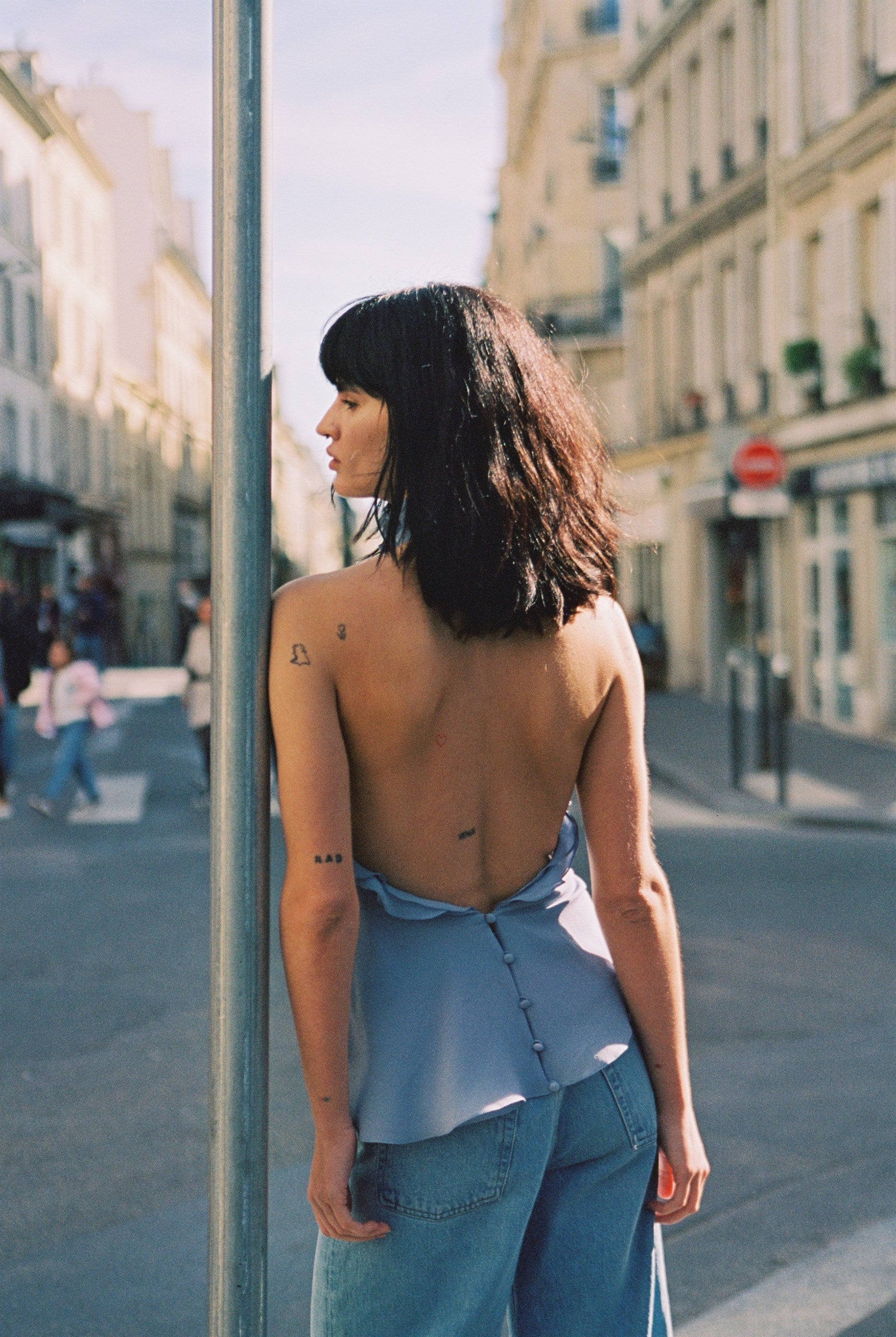 This exquisite silk top is a showcase of elegant design, featuring an open back. Delicate ruffles trim the edges, complementing the free-flowing silhouette. Presented in celestial blue and creamy white with a lace-like texture, this piece blends romantic flair with effortless elegance. Versatile enough for an evening out or casual daytime wear, this top adds a sophisticated and unique touch to any ensemble.