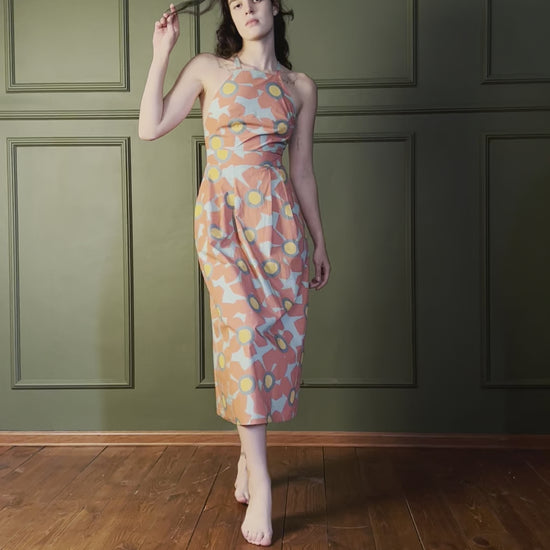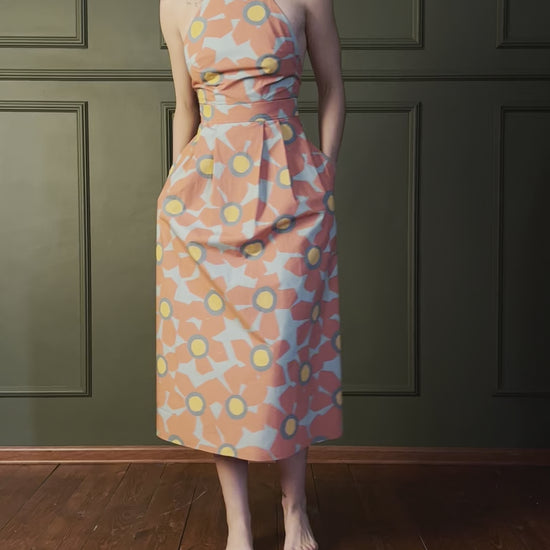 Sundress with open back. Midi length, hidden zipper on the skirt, pockets and adjustable shoulder straps.